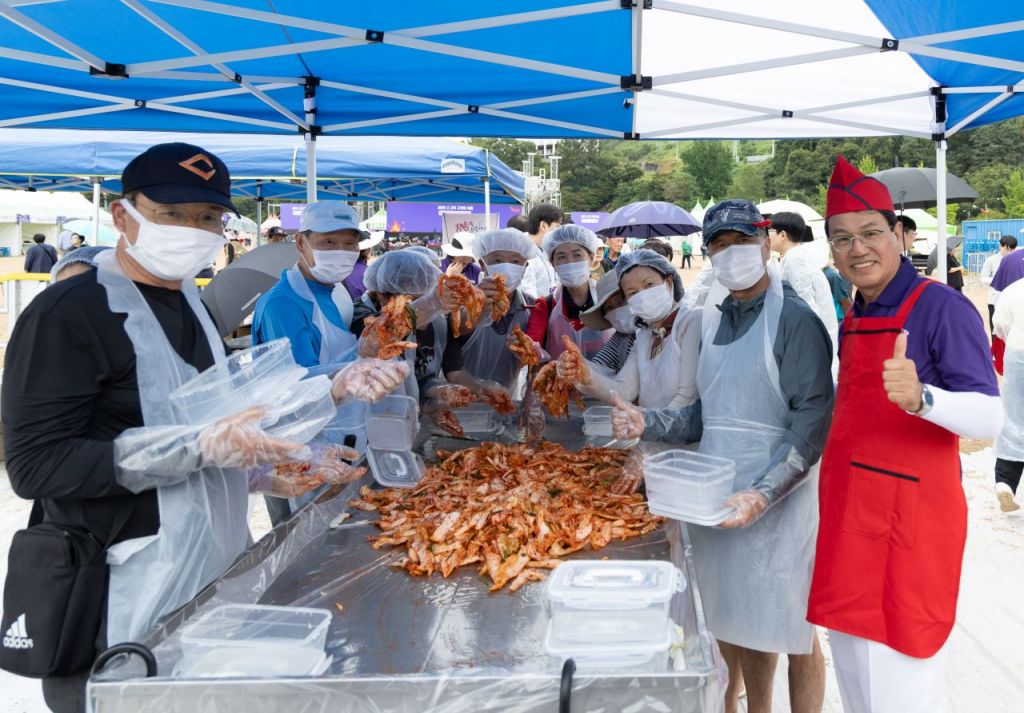 청양고추구기자축제에서 대형 겉절이 체험행사를 진행하고 있다./청양군