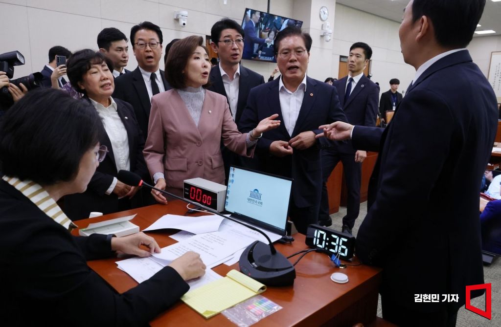 22일 국회 법사위원회에서 열린 검찰개혁 입법청문회에서 퇴장 조치를 받은 국민의힘 나경원, 송석준, 조배숙 의원이 추미애 위원장에게 항의하고 있다. 2025.9.22 김현민 기자