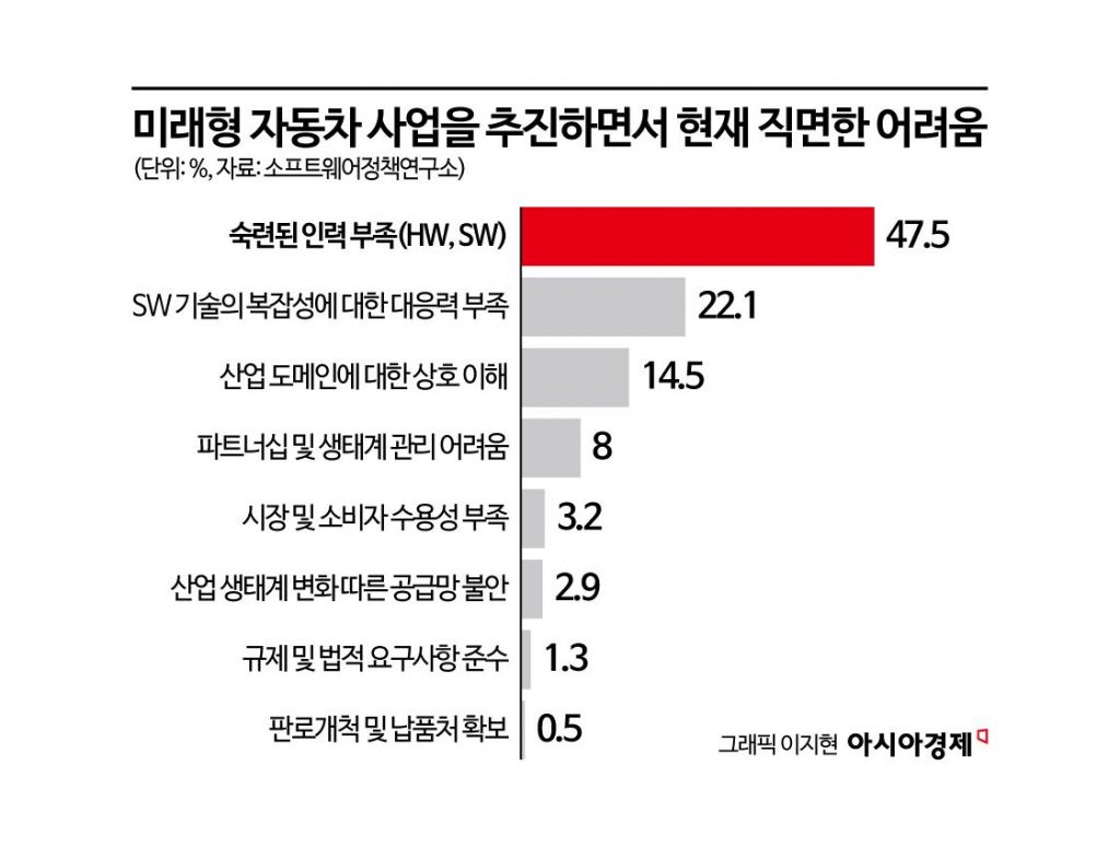 지은희 소프트웨어정책연구소 연구위원이 펴낸 '미래형 자동차 산업의 SW 인력 양성 연구' 보고서에는 이 같은 업계의 고충이 그대로 드러나 있다. 보고서는 미래형 자동차 관련 산업을 영위하는 △완성차 및 부품 제조 기업(엔지니어링 서비스 기업 포함) △ICT 기업(HW·SW 서비스) △인프라 기업(통신·도로 교통·충전 기업) 등 국내 2485개 기업을 대상으로 조사를 실시했다.