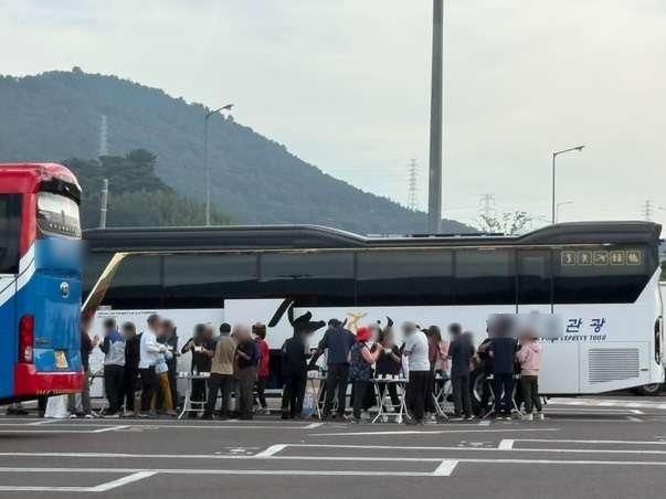 사진 속에는 20여명의 단체가 대형버스 전용 주차장 사이 빈 공간에서 테이블을 펴고 음식을 먹고 있었다. 제보자에 따르면 테이블에는 음식은 물론 초록색 병 소주도 있었던 것으로 전해졌다.