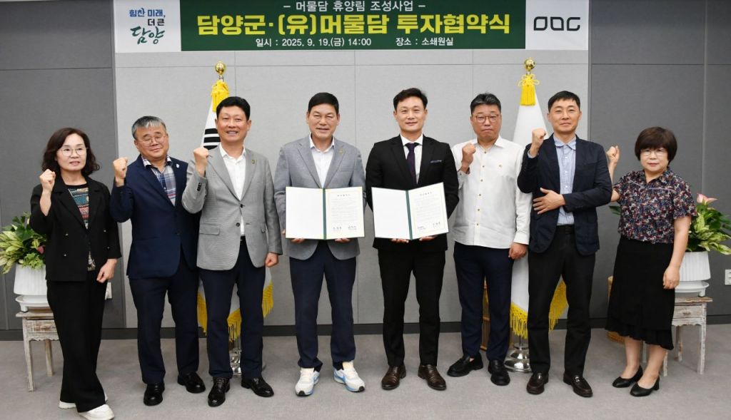 전남 담양군(군수 정철원)은 최근 (유)머물담과 금성면 원율리 일원에 '머물담 휴양림 조성사업'을 추진하기 위한 투자협약을 체결했다고 22일 밝혔다.