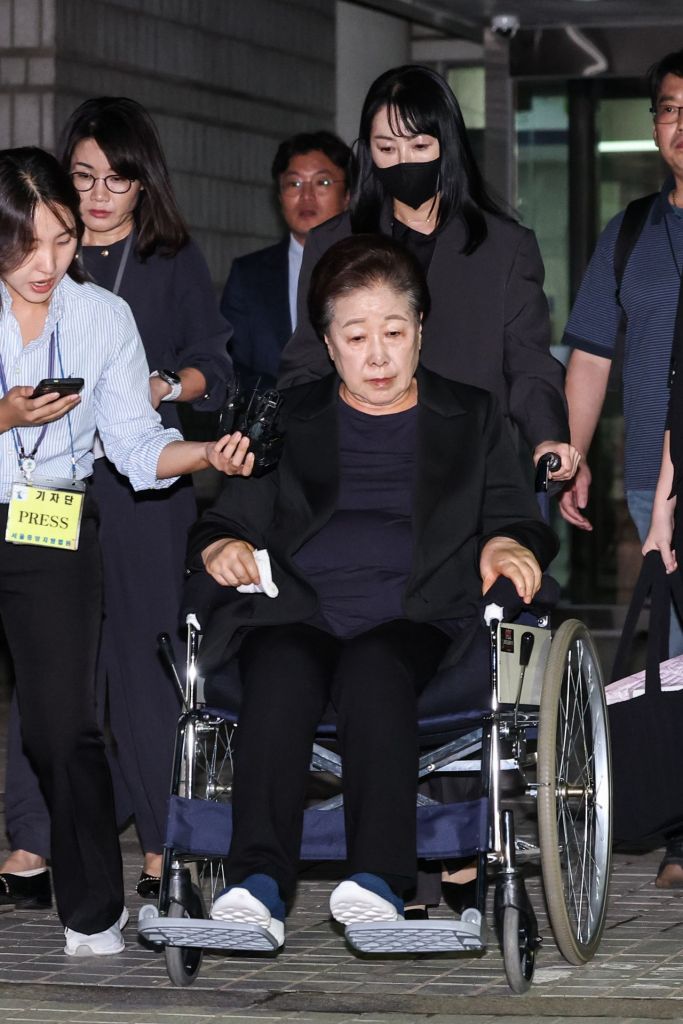 한학자 통일교 총재가 22일 서울중앙지법에서 구속 전 피의자 심문(영장실질심사)을 마친 뒤 법정을 나서고 있다. 연합뉴스