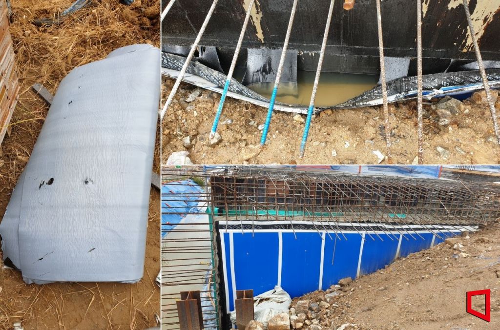 경기 LH 아파트 건설 현장. (맨왼쪽)지하주차장 외벽 방수에 쓰일 시트 자재가 찢기고 구겨진 채 방치돼 있다. (오른쪽 상단)외벽 방수 시공 후 끝단 마감이 누락돼 시트가 들뜨고, 내부에 빗물이 고인 모습. 비가 내리자 외벽을 타고 스며든 물이 시트 안쪽에 고여 방수층 전체가 손상됐다. (오른쪽 하단)LH 품질명장이 해당 부위를 확인한 뒤 전체적으로 다시 걷어내고 보수해야 한다고 지적해 재시공한 구간으로, 손상된 구간을 걷어내고 끝단을 스테인리스 판으로 고정한 뒤 새 시트를 부착한 모습. 파란색 보호판을 덧대 흙을 되메움할 때 방수층이 다시 손상되지 않도록 마감했다.