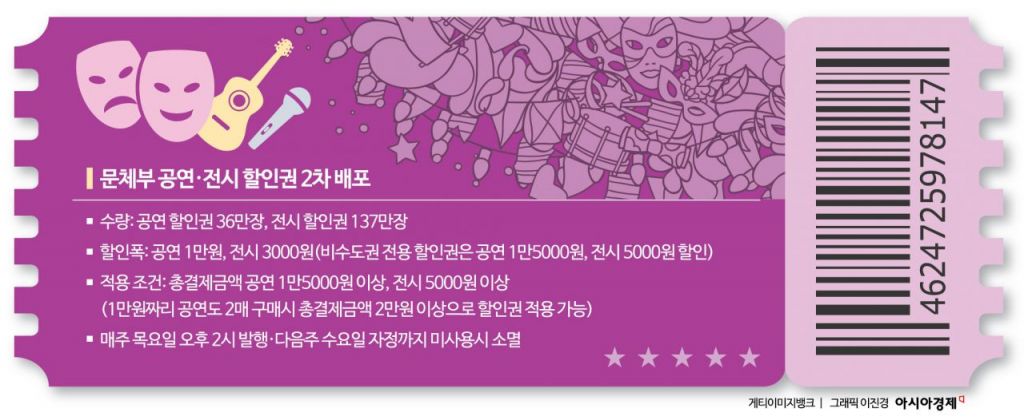 문화체육관광부가 국민의 문화 향유 기회를 확대하고 문화 소비를 촉진하기 위해 오는 25일 오후 2시부터 공연 1만원 할인권 약 36만장, 전시 3000원 할인권 약 137만 장을 배포한다.