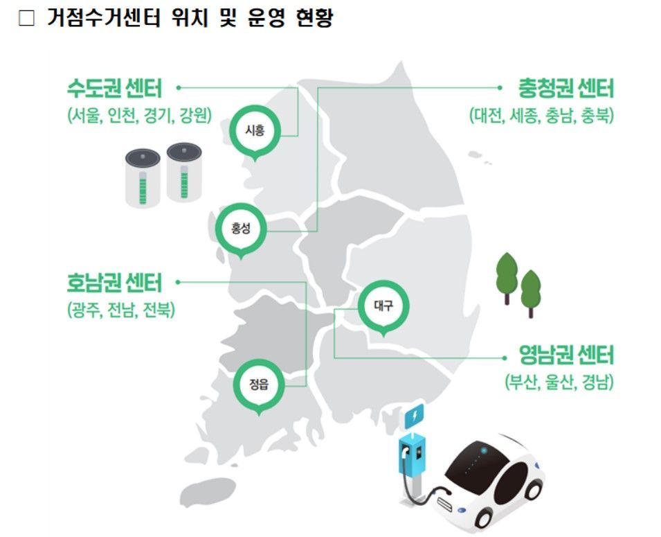 이번 협약에 따라 수도권, 영남권(대구 달서구 소재), 호남권(전북 정읍시 소재), 충청권(충남 홍성군 소재)의 4개 미래 폐자원 거점수거센터에서 비반납 사용후 배터리의 입고, 성능평가, 보관, 매각 등의 업무를 처리할 계획이다.