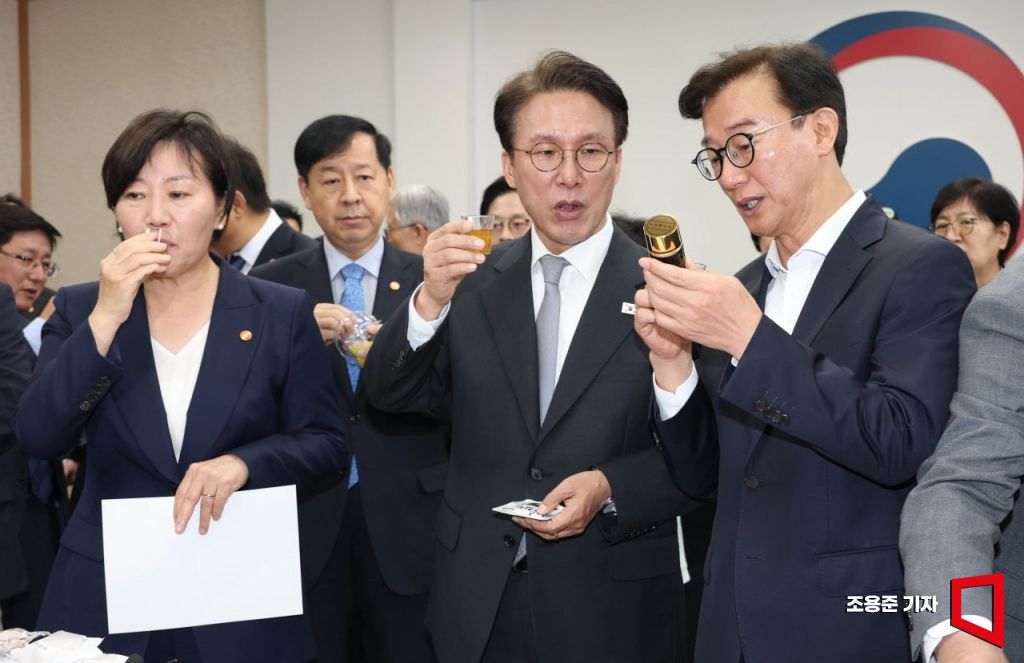 김민석 국무총리와 국무위원들이 23일 서울 종로구 정부서울청사 국무위원 대기실에서 열린 추석명절 맞이 민생 선물세트와 농수산물 가공식품 소비촉진 행사에 참석해 전시된 상품을 살펴보고 있다.