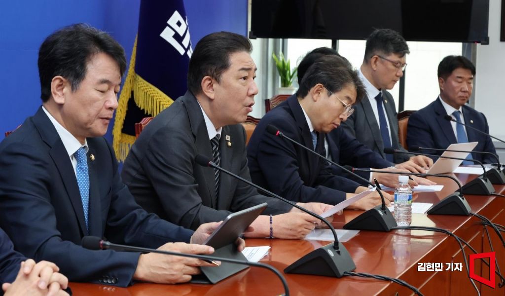 김병기 더불어민주당 원내대표가 23일 국회에서 열린 원내대책회의에서 발언하고 있다.