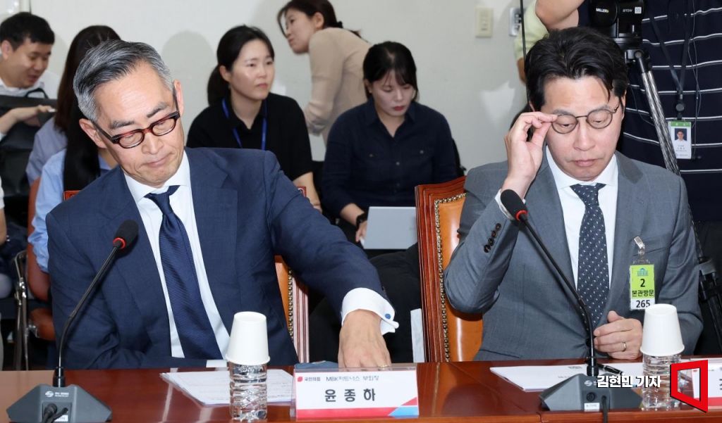 조좌진 롯데카드 대표이사(오른쪽)와 윤종하 MBK파트너스 부회장이 23일 국회에서 국민의힘 주최로 열린 '롯데카드 개인정보 유출사태, 피해자 보호 방안 및 재발 방지 대책 간담회'에 참석하고 있다. 2025.9.23 김현민 기자