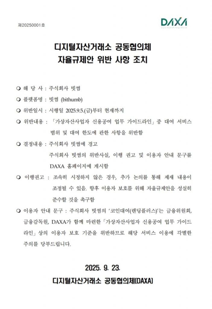 그러면서 "빗썸의 코인대여는 금융위원회, 금융감독원, 닥사가 함께 마련한 '가상자산사업자 신용공여 업무 가이드라인' 상의 이용자 보호 기준을 위반하므로 해당 서비스 이용에 각별한 주의를 당부한다"고 덧붙였다.