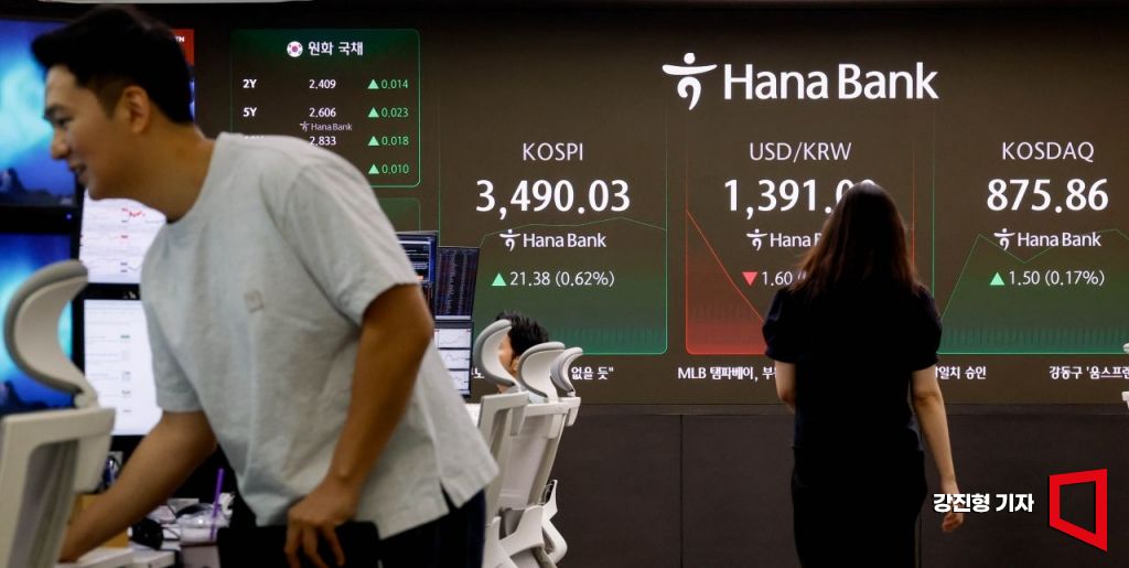 코스피 지수가 장 초반 3490선을 돌파하며 장중 사상 최고치를 경신한 23일 서울 중구 하나은행 본점 딜링룸에서 딜러들이 업무를 보고 있다. 2025.9.23 강진형 기자