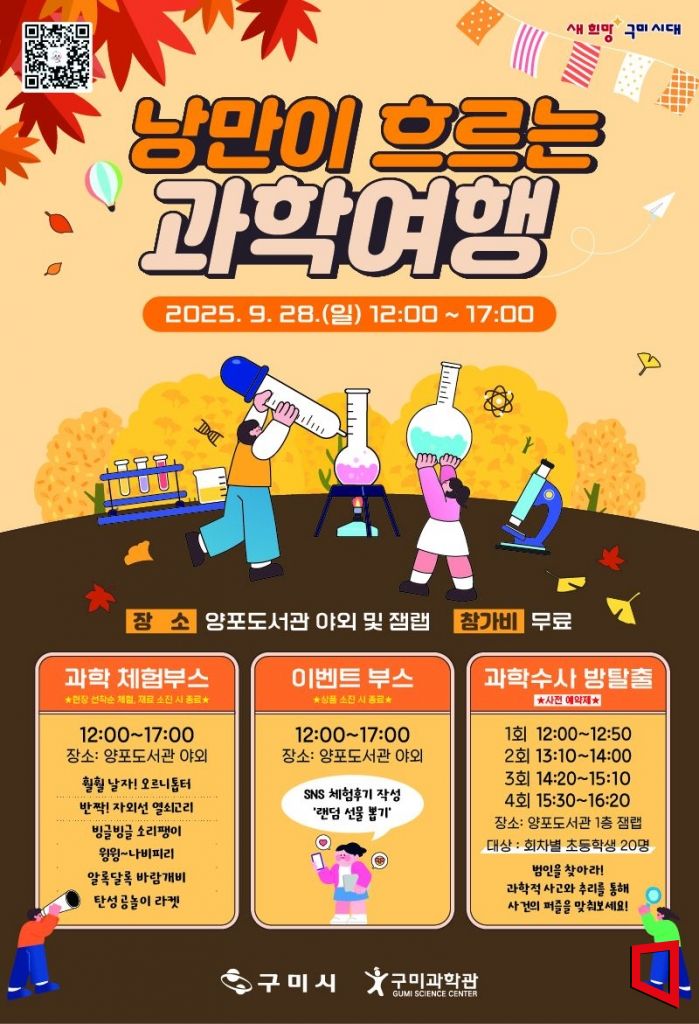 경북 구미어린이과학체험관(구미시립양포도서관 내)은 9월 28일 어린이들이 과학적 호기심을 키우고 창의력을 발휘할 수 있는 '낭만이 흐르는 과학여행'을 개최한다.