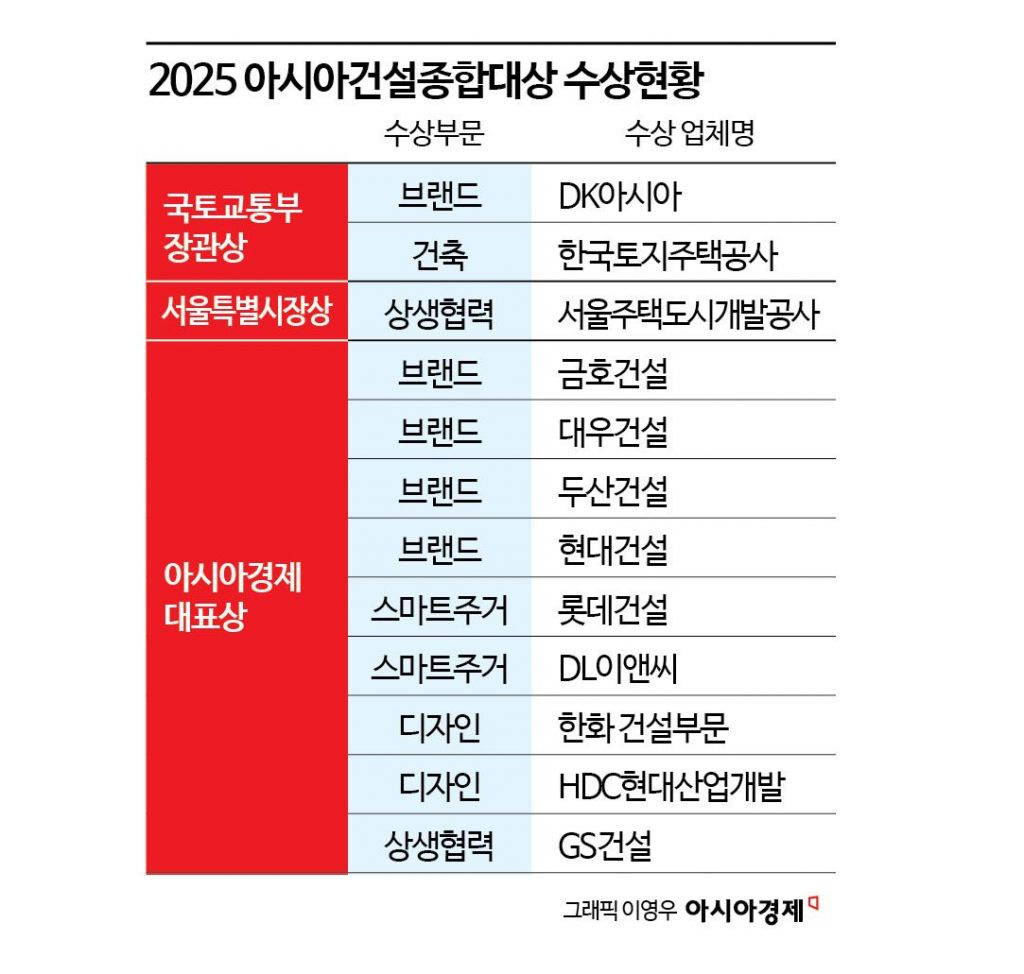 올해로 제20회를 맞은 '아시아건설종합대상'에서 영예의 국토교통부장관상은 DK아시아, 한국토지주택공사(LH)가 받았다. 서울특별시장상은 서울주택도시개발공사(SH)가 받았다. 금호건설을 비롯해 대우건설, 두산건설, 현대건설, 롯데건설, DL이앤씨, 한화 건설 부문, HDC현대산업개발, GS건설 등은 아시아경제대표상을 받았다.