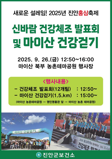 전북 진안군이 오는 26일 진안홍삼축제 마이산 북부 농촌테마공원 행사장 주무대에서 '신바람 건강체조 발표회와 마이산 건강걷기 대회'를 연다.