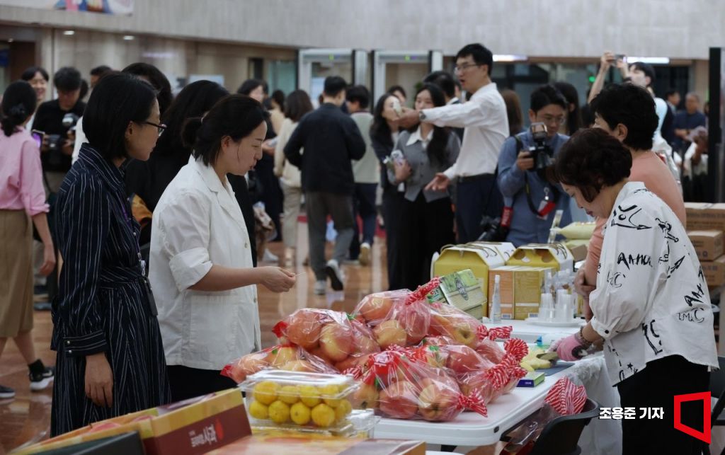 24일 서울 종로구 정부서울청사에서 '2025 한가위 선물장터'가 열린 가운데 청사 직원들이 명절 선물 세트와 과일 등을 살펴보고 있다.