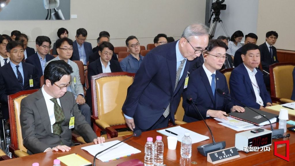 김영섭 KT 대표이사가 24일 국회 과학기술정보방송통신위원회에서 열린 통신·금융 대규모 해킹사고에 대한 청문회에 출석해 고개 숙여 인사하고 있다. 앞줄 왼쪽부터 윤종하 MBK파트너스 부회장, 조좌진 롯데카드 대표이사, 김영섭 KT 대표이사. 2025.9.24 김현민 기자