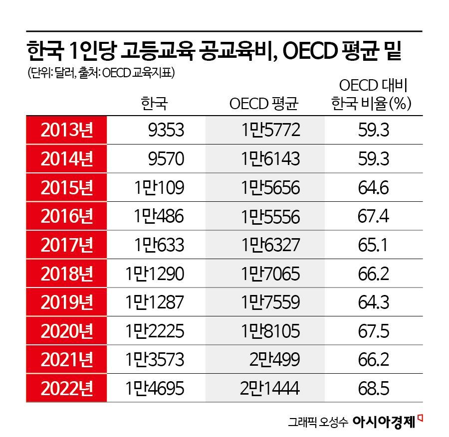 29일 아시아경제가 경제협력개발기구(OECD) 교육지표를 분석한 결과, 한국의 고등교육 재정은 10년 이상 OECD 평균의 60~70%에 그쳤다. 한국의 1인당 대학 공교육비는 OECD 평균 대비 2018년 66.2%, 2019년 64.3%, 2020년 67.5%, 2021년 66.2%, 2022년 68.5% 수준이었다. 2021년 기준으로 보면 한국의 1인당 대학 공교육비는 1만3573달러로 미국(3만6274달러)의 37.4%, 일본(2만518달러)의 66.2%에 불과했다.