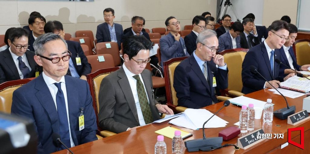 24일 국회 과학기술정보방송통신위원회에서 열린 통신·금융 대규모 해킹사고에 대한 청문회에서 김영섭 KT 대표이사 등 증인들이 참석하고 있다. 앞줄 왼쪽부터 윤종하 MBK파트너스 부회장, 조좌진 롯데카드 대표이사, 김영섭 KT 대표이사. 2025.9.24 김현민 기자