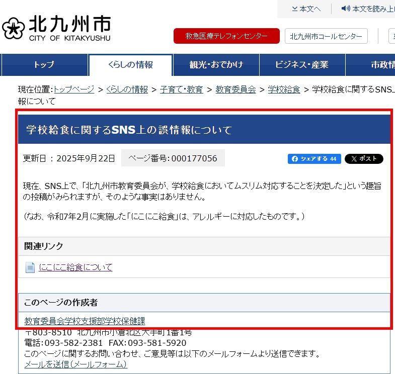 기타큐슈시 교육위원회가 시 홈페이지에 공지한 무슬림 급식 해명