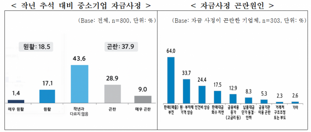 조사 결과 작년 추석에 비해 올 추석 자금 사정이 곤란하다는 응답이 37.9%로 원활하다는 응답(18.5%)보다 높게 나타났다. '작년과 다르지 않다'는 응답은 43.6%를 차지했다. 자금사정 곤란원인(복수응답)으로는 '판매·매출부진(64.0%)'을 가장 많이 꼽았으며, 이어 ▲원·부자재가격 상승(33.7%) ▲인건비 상승(24.4%) ▲판매대금 회수 지연(17.5%) 순으로 응답했다.