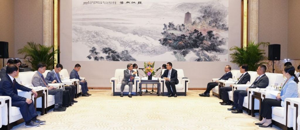 강기정 광주시장이 지난 24일 오후 중국 항저우 인터콘티넨탈호텔에서 루산(山) 저장성 부성장과 면담을 갖고 항저우시와 AI 정책 등 교류협력 방안을 논의하고 있다. 광주시 제공