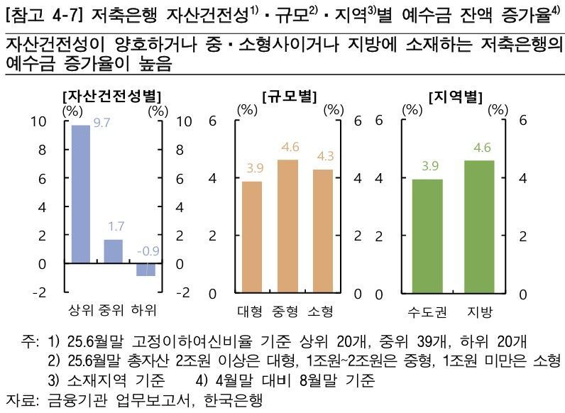규모별로는 대형 저축은행이 3.9% 늘어난 반면, 중·소 저축은행은 각각 4.6%·4.3% 늘어 중·소형사의 증가율이 높게 나타났다. 지역별로는 수도권 저축은행이 3.9% 증가한 데 비해 지방 저축은행은 4.6% 늘어 더 큰 폭의 수신 증가율을 나타냈다. 한은 관계자는 "대형·수도권으로의 예금이동을 우려한 저축은행들이 업권 평균보다 예금금리를 올리면서 증가세가 확대된 것으로 보인다"고 말했다.