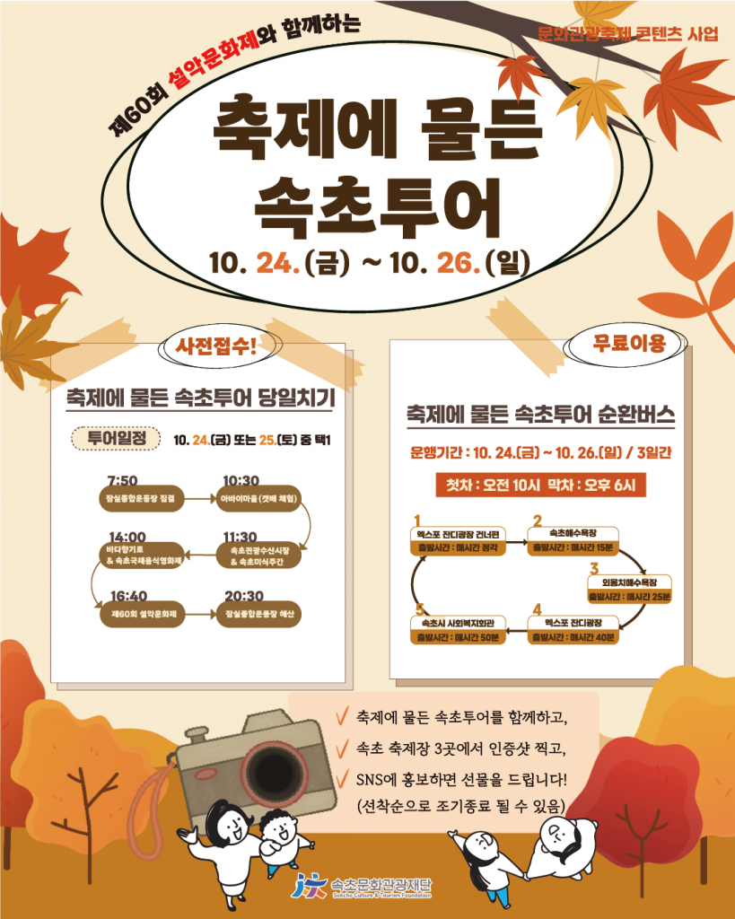 (재)속초문화관광재단은 제60회 설악문화제를 맞아 수도권 시민들이 가을 정취 가득한 속초의 대표 축제를 한 자리에서 체험할 수 있도록 특별 기획된 문화관광 콘텐츠 '축제에 물든 속초투어'를 운영한다.