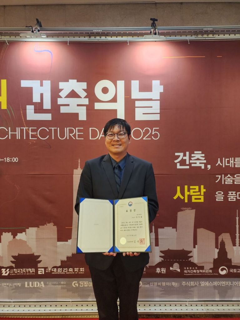 정주홍 교수는 지난 25일 서울 서초구 건축사회관에서 열린 '제21회 건축의 날' 기념식에서 김윤덕 국토교통부 장관으로부터 표창장을 받았다. 이번 행사는 '건축, 시대를 담고 기술을 넘어 사랑을 품다'를 주제로 진행되었다.