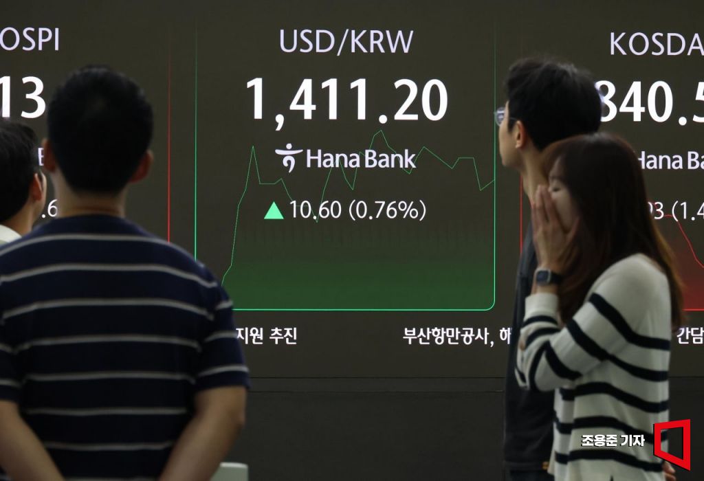 원·달러 환율은 전날 주간 거래를 1400.6원에 마감, 지난 8월1일(1401.4원) 이후 두 달여 만에 심리적 저항선인 1400원을 웃돌았다. 이후 같은 날 야간 거래에선 장 중 1411.0원까지 뛰었다. 이날 역시 전일 주간 거래 종가 대비 8.4원 오른 1409.0원으로 개장했다. 주간 거래에서 장중 1410원대를 뚫은 것은 지난 5월15일(장 중 고가 1412.1원) 이후 처음이다.