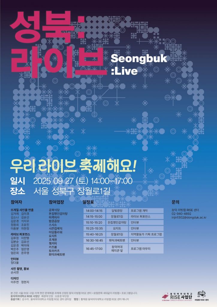 동덕여자대학교 리빙랩 RISE 센터는 27일 오후 2시 서울 성북구 월곡동 장월로1길 일대에서 '2025 성북:라이브'를 개최한다.