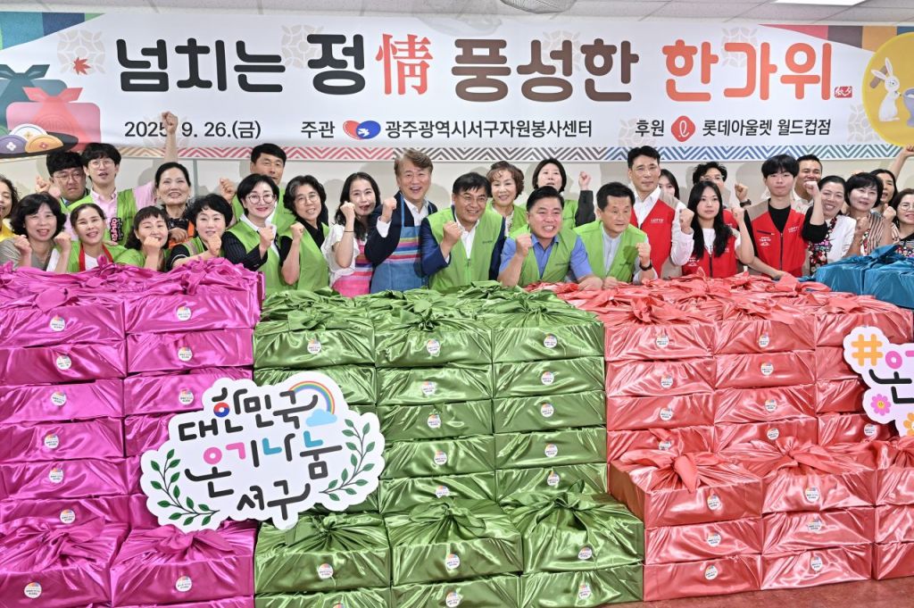김이강 광주 서구청장이 26일 민족 대명절 추석을 앞두고 서구청 구내식당에서 열린 서구자원봉사센터 명절맞이 동캠프·자원봉사단체 연합 활동 '넘치는 정(情) 풍성한 한가위'에서 참석자들과 기념 촬영을 하고 있다. 광주 서구 제공