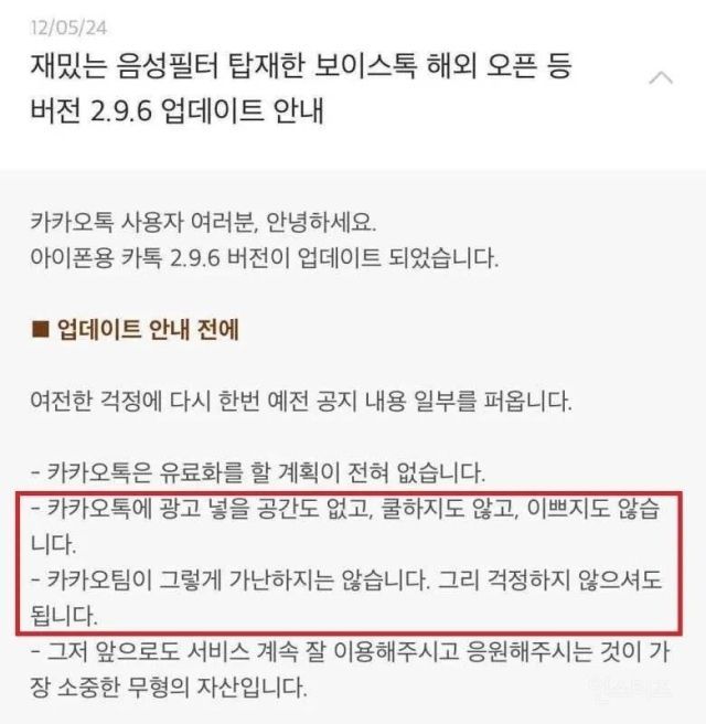 당시 카카오 측은 '카카오톡에 광고 넣을 공간도 없고 쿨하지도 않고 예쁘지도 않다'고 밝혔다. 또한 '카카오팀이 그렇게 가난하지는 않다'고 공지했다. 이는 유료화 계획이 없다고 선을 긋고 광고에 부정적인 입장을 드러냈다. 이 글은 카카오가 2019년 광고를 처음 도입한 이후 광고를 확대할 때마다 온라인상에 이른바 '재소환'되고 있다. 사회관계망서비스(SNS)와 온라인 커뮤니티에서는 "가난해졌나보다" "이래서 공지는 신중하게 써야 한다" 등 반응이 이어졌다.