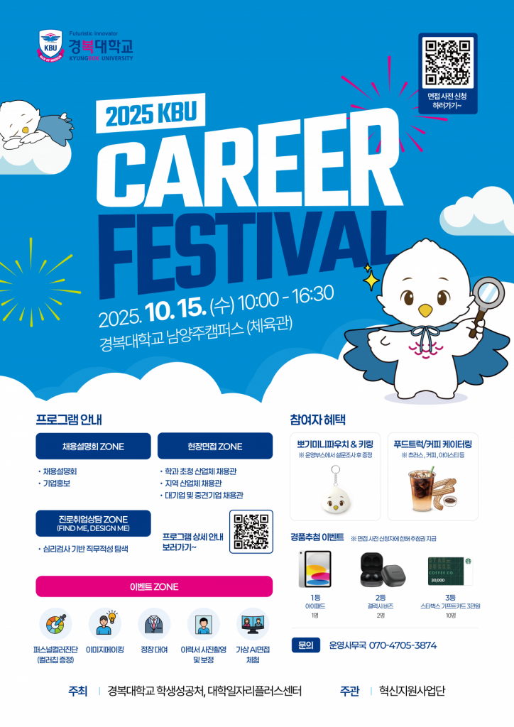 경복대학교가 오는 10월15일 남양주캠퍼스 체육관에서 커리어 페스티벌(2025 KBU Career Festival) 채용박람회를 개최한다.