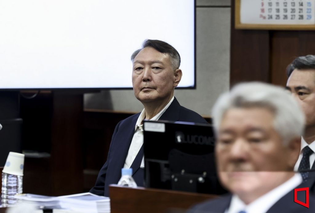 윤석열 전 대통령이 26일 서울 서초구 서울중앙지방법원에서 열린 '특수공무 집행 방해, 직권남용 권리행사 방해 혐의' 첫 재판에 출석해 있다. 사진공동취재단