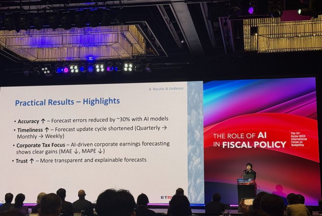 세션 1 발표자인 이 센터장은 "(기재부와) 작년에 실시간 세수 추계 연구를 시작해 같이 일하고 있다"며 "지난 3~4년 동안 수십조원의 세수 추계 오차를 겪었고, 정확한 세수 추계 없이는 재정 정책을 신뢰성 있게 수립하는 게 어렵기에 예측하려 하는 것"이라고 말했다. 그는 "특히 주목하는 것은 법인세"라며 "기업 실적과 경기 사이클에 따라 (세수) 오차의 주요 원인으로 작용하기 때문"이라고 설명했다. 또 "법인세 예측에 특화한 AI 모델을 개발하려고 한다"고 했다.