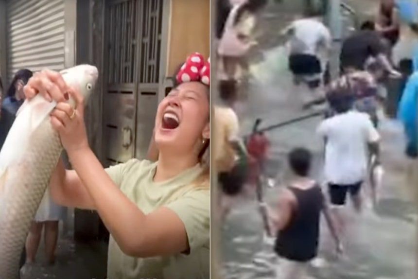 영상에는 무릎 높이까지 물이 찬 도심에서 주민들이 그물, 어망, 심지어 가방까지 활용해 물고기를 잡는 장면이 담겼다. 일부는 인큐베이터 같은 황당한 도구를 들고나오기도 했다.