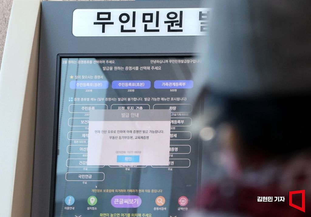 전국 지방자치단체 행정 전산망에 장애가 발생한 17일 서울 국회 의원회관 민원실 내 무인민원발급기에 네트워크 장애가 안내되고 있다. 김현민 기자