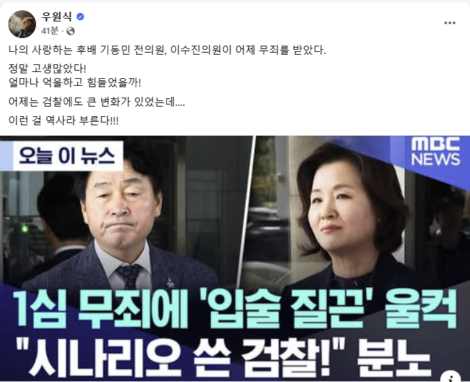 우 의장은 이날 자신의 페이스북에 두 사람을 '나의 사랑하는 후배'라 칭하며 이들의 무죄 소식을 전하는 언론 보도를 링크하고 이같이 적었다.