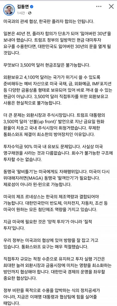 특히 "더 큰 문제는 외환시장과 주식시장"이라며 "트럼프 대통령의 3500억 달러 '선불(up front)' 발언으로 지난 금요일 원화 환율이 치솟고 국내 주식시장이 휘청거렸다"고 우려했다.