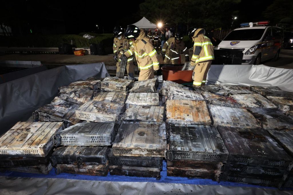 지난 27일 밤 대전 유성구 국가정보자원관리원 화재 현장에서 소방대원이 소화수조에 불에 탄 리튬이온 배터리를 넣고 있다. 연합뉴스