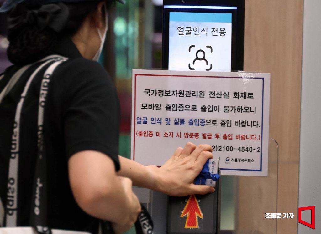 국가정보자원관리원 화재로 정부 전산망이 사실상 마비된 가운데 29일 서울 종로구 정부서울청사 내 출입구에 '국가정보자원관리원 화재로 모바일 출입증으로 출입 불가' 안내문이 붙어 있다. 2025.9.29 조용준 기자