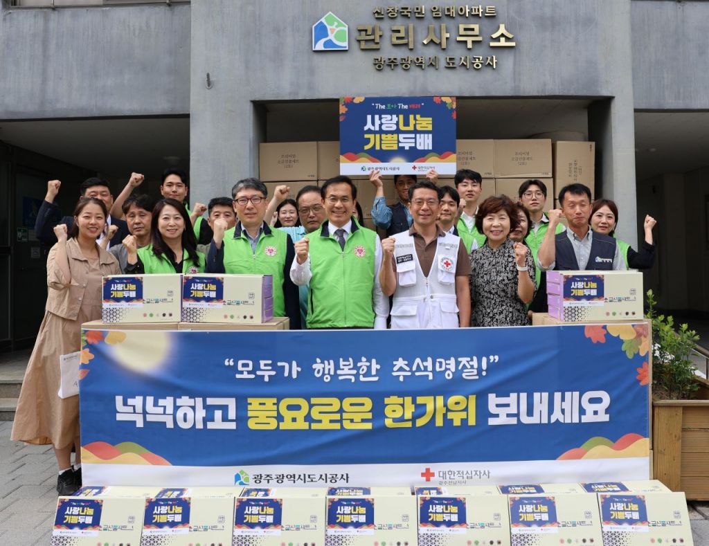 광주도시공사(사장 김승남)는 추석 명절을 맞아 지난 29일 한국적십자사 광주전남지사와 함께 '추석맞이 노사공동 사랑의 선물 전달 행사'를 진행했다고 30일 밝혔다.