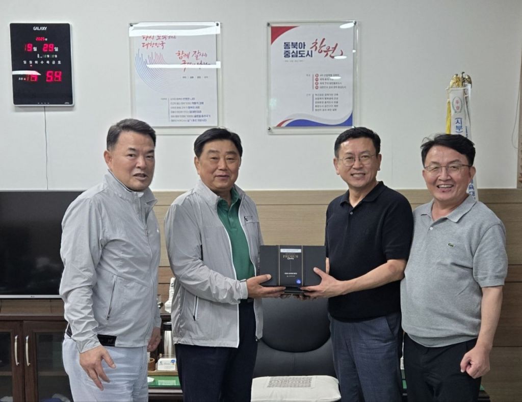 경남 창원시씨름협회 백경수(라쉬반 대표) 회장과 후원사 김승현 프레시 유통 대표가 지난 29일 창원시체육회를 방문해 직원들을 격려했다.
