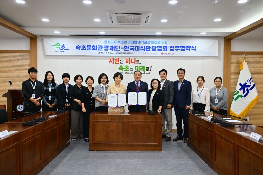 재단법인 속초문화관광재단(이사장 이병선, 속초시장)이 지난 10월 1일 사단법인 한국미식관광협회와 '지속 가능한 미식도시 조성을 위한 업무협약'을 체결하고 있다. 속초시 제공