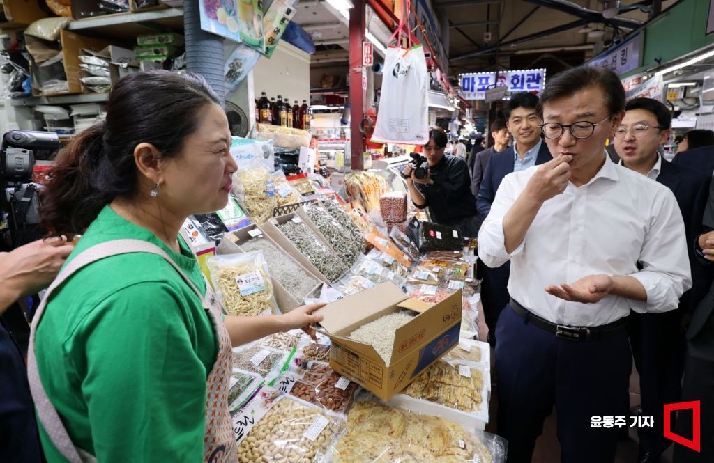추석 명절을 앞두고 전재수 해양수산부 장관이 1일 서울 마포구 농수산물시장을 방문, 직접 구매한 국내산 멸치를 시식하고 있다. 전 장관은 이 날 장바구니 물가를 점검하고 온누리상품권 환급행사 현장을 둘려봤다.