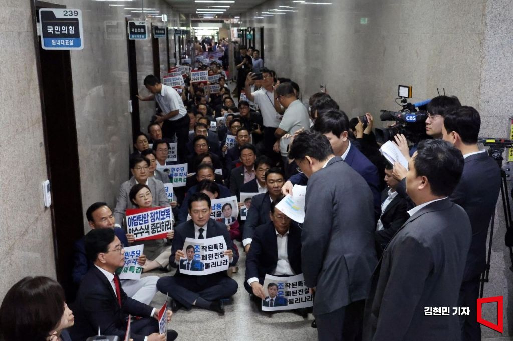 지난달 3일 국회에서 '계엄 해제 표결 방해 의혹'을 수사하는 조은석 내란 특별검사 수사관들이 국민의힘 원내대표실 압수수색을 시도하자 농성중인 국민의힘 의원들이 반발하며 막아서 있다.