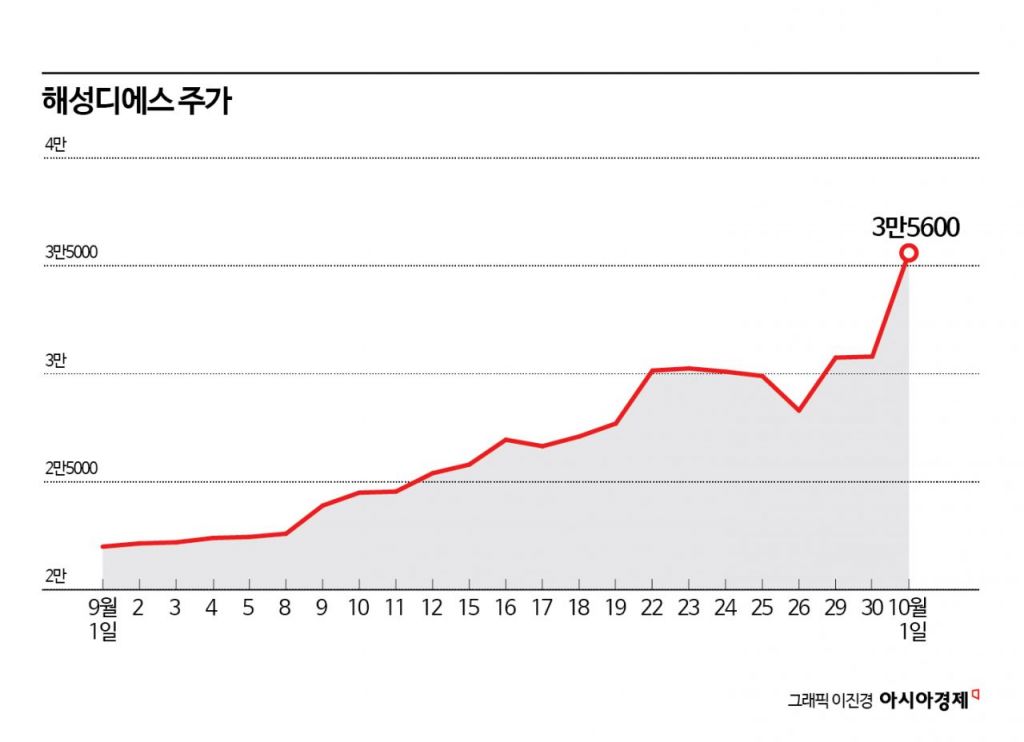 2일 금융투자업계에 따르면 해성디에스 주가는 지난 8월 말 2만2450원에서 3만5450원으로 57.9% 상승했다. 전날 주가가 장중 한때 3만5900원을 기록하면서 52주 신고가를 다시 썼다. 시가총액은 6000억원을 돌파했다. 외국인이 지난달부터 150억원 이상 누적 순매수를 기록하면서 주가 상승을 이끌었다. 외국인은 평가수익률 26.7%를 기록했다.