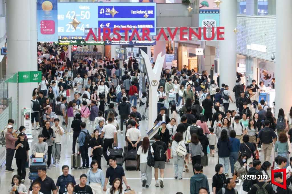 추석 황금연휴를 앞둔 2일 인천국제공항 제1여객터미널 면세구역을 찾은 여행객들로 붐비고 있다.