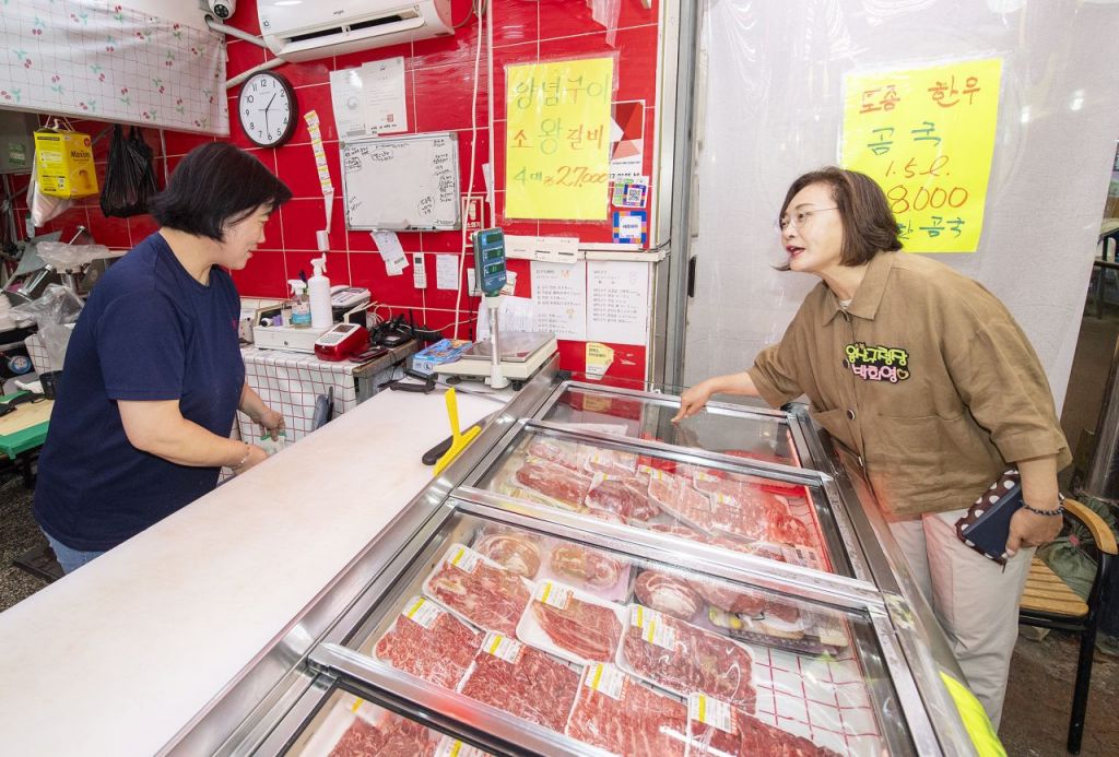 박희영 서울 용산구청장이 추석 명절을 앞두고 전통시장과 골목형상점가를 방문해 온누리상품권으로 장을 보며 상인들과 소통하고 있다. 용산구 제공.