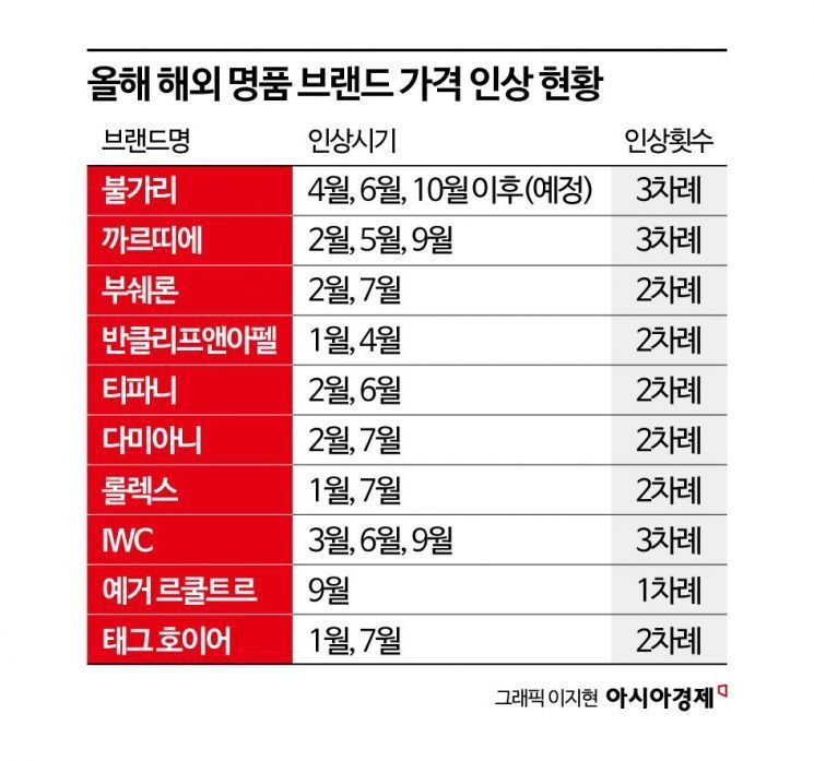 이외에도 부쉐론(2월, 7월), 반클리프앤아펠(1월, 4월), 티파니(2월 6월), 다미아니(2월, 7월), 롤렉스(1월, 7월), 태그 호이어(1월, 7월)는 연내 두 차례 가격 인상에 나섰다. 인상률은 5~10% 수준이다.