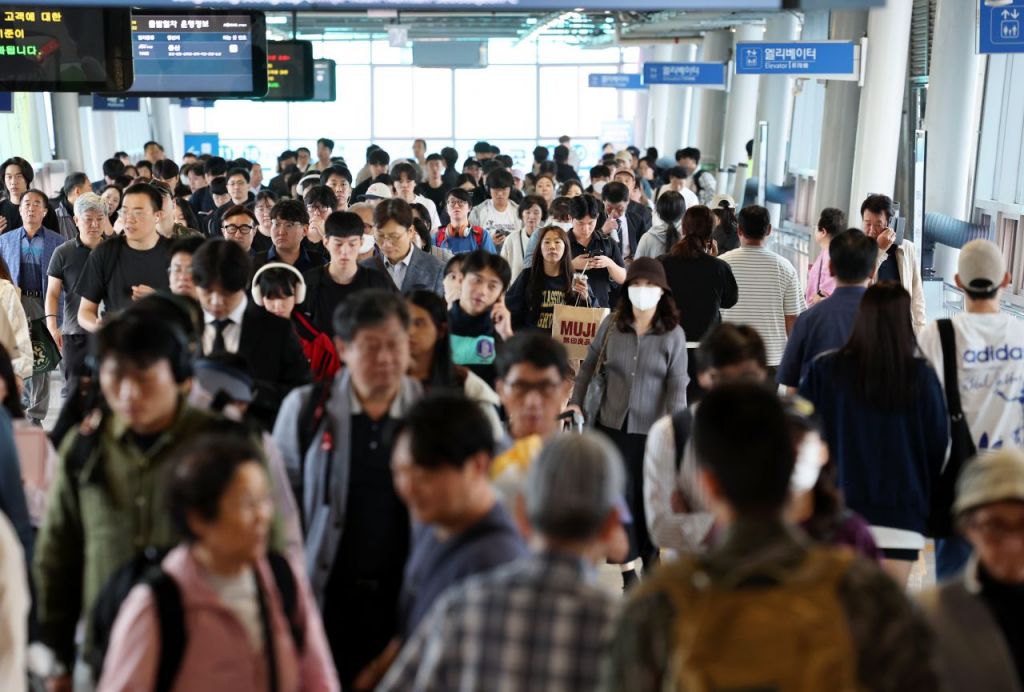 추석 연휴를 하루 앞둔 2일 광주 광산구 광주송정역에 도착한 열차에서 내린 귀성객과 시민들이 이동하고 있다. 연합뉴스